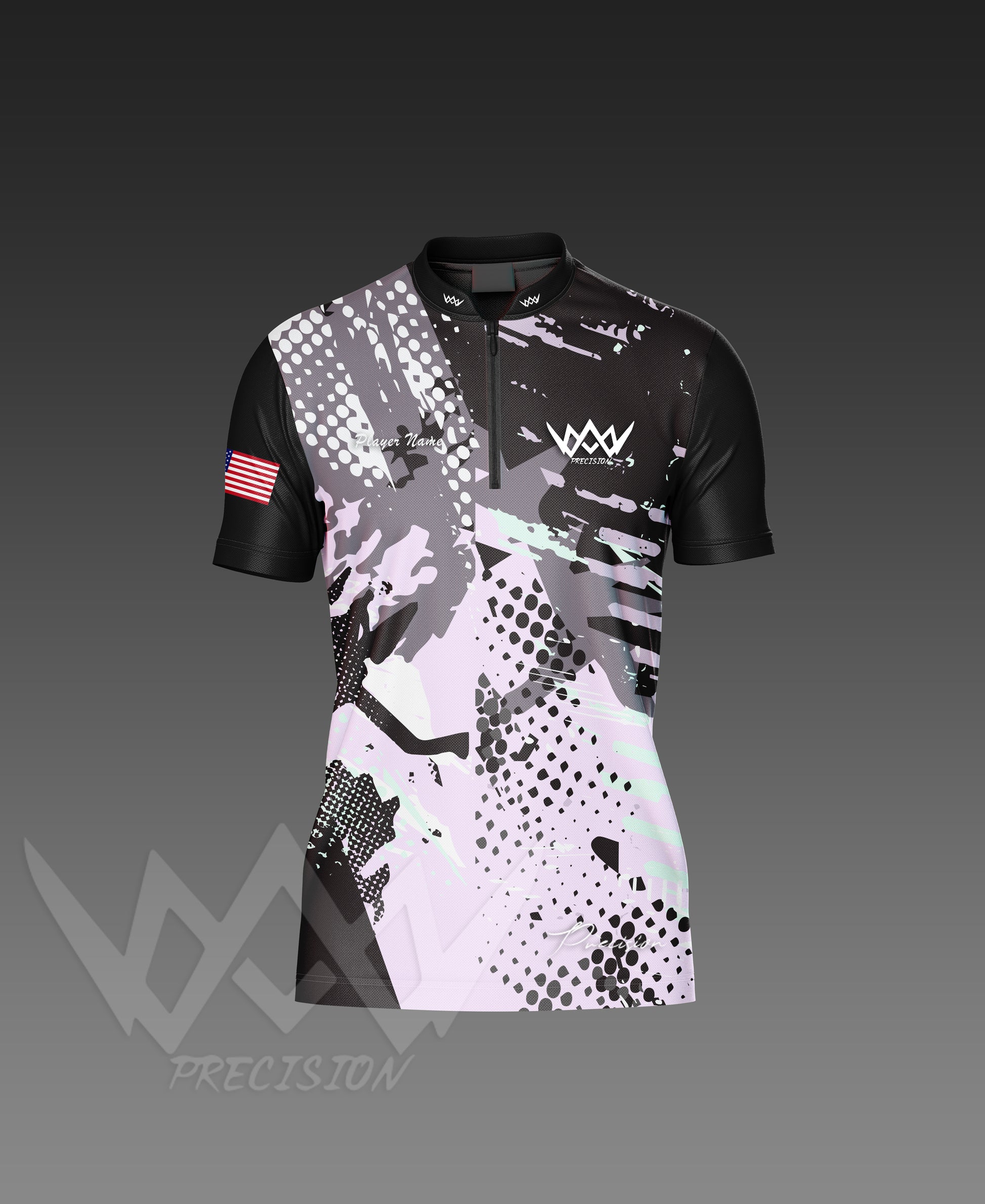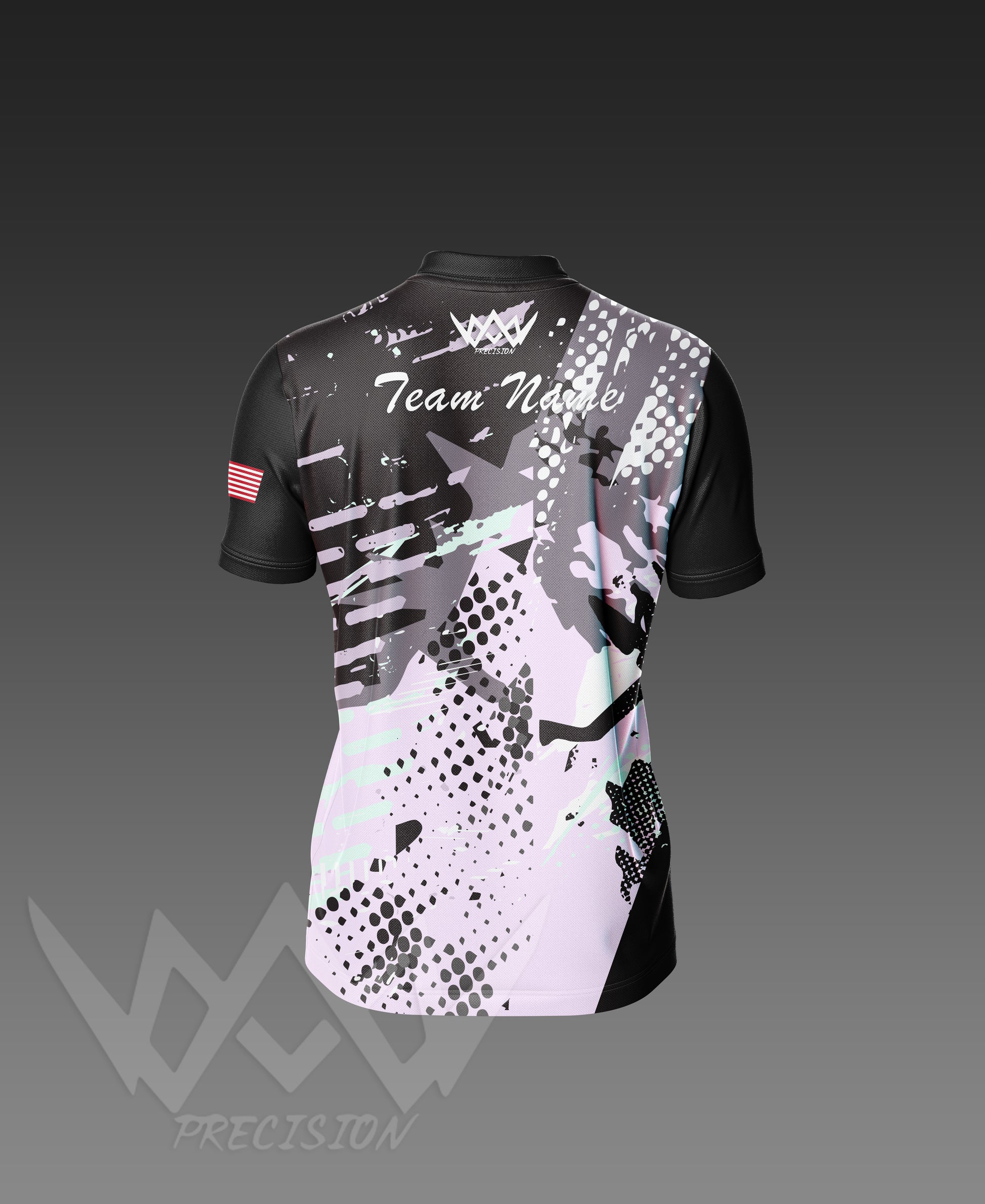 The Precision Series 6 jersey fuses a street-inspired black-and-lavender abstract pattern with high-contrast texture detailing for a bold, one-of-a-kind look. The sleek black sleeves and collar balance the design, while the athletic cut ensures peak comfort and mobility. Made from lightweight, moisture-wicking fabric to keep you cool no matter how intense the game gets. Finished with the Precision logo, U.S. flag patch, and your custom name.