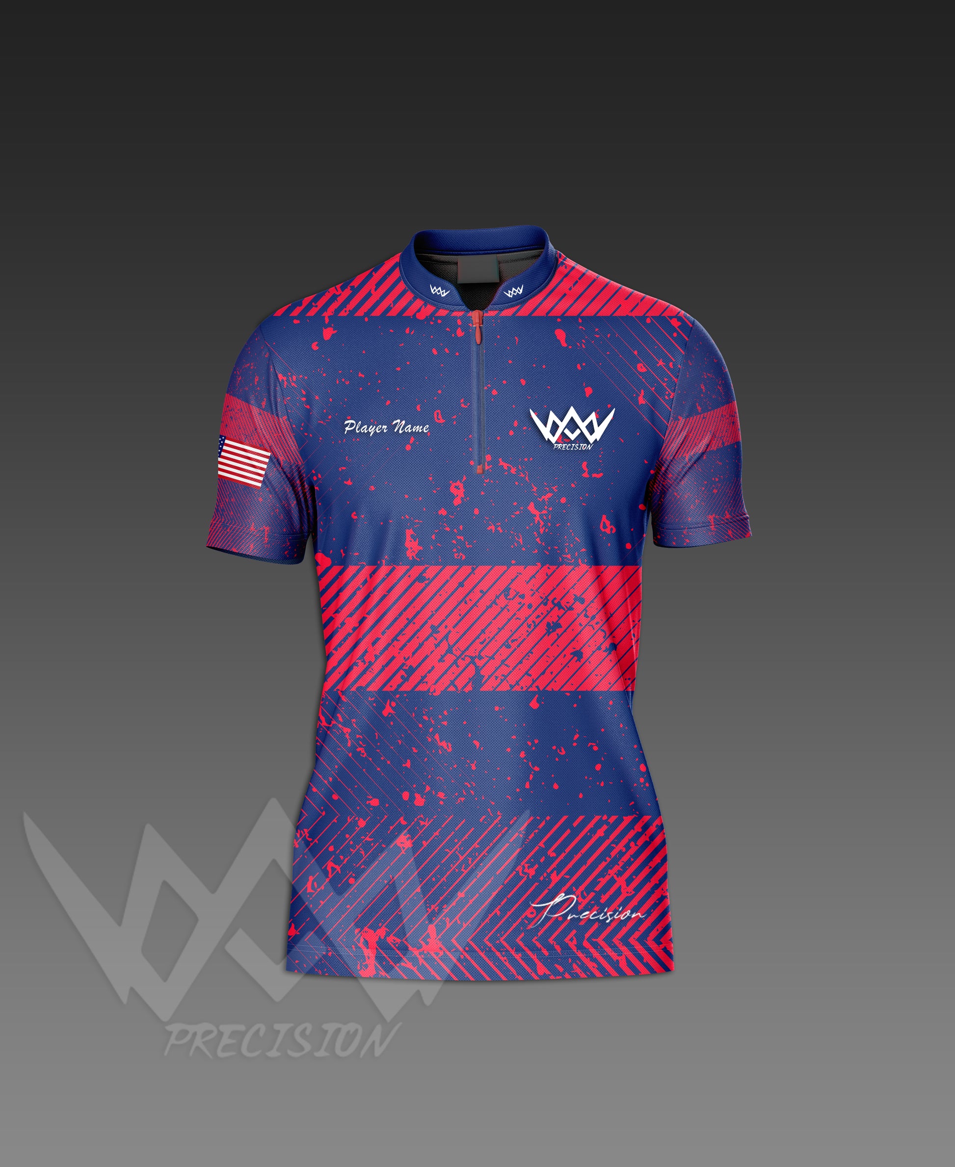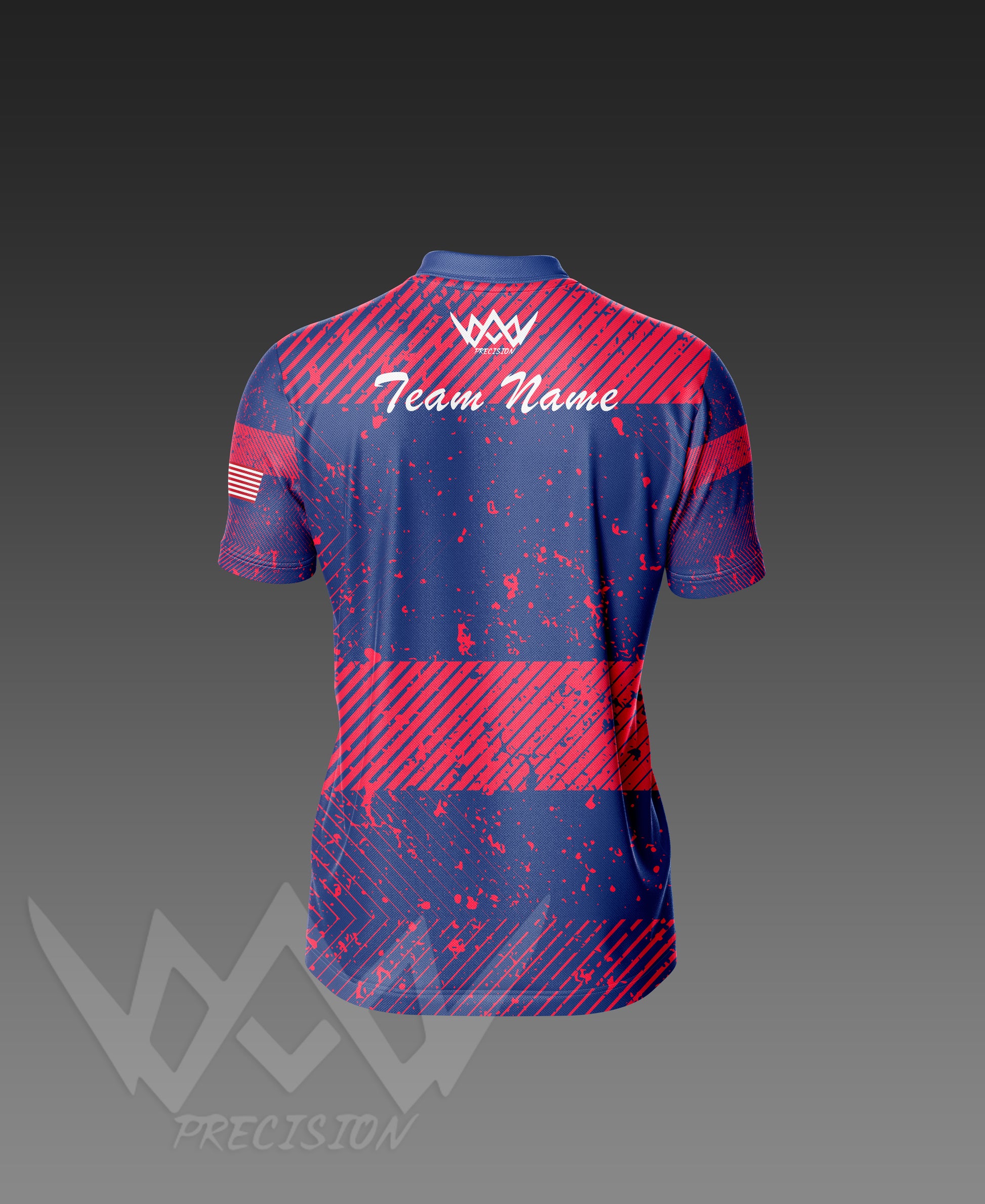 Where bold meets battle-ready. The Pro Series Jersey 1 features deep navy base tones accented with aggressive red streaks and splatter for a look that hits as hard as you play. Lightweight, moisture-wicking, and built with 4-way stretch — this is performance gear made for tournament warriors. Includes USA flag patch, Precision branding, and custom player name.