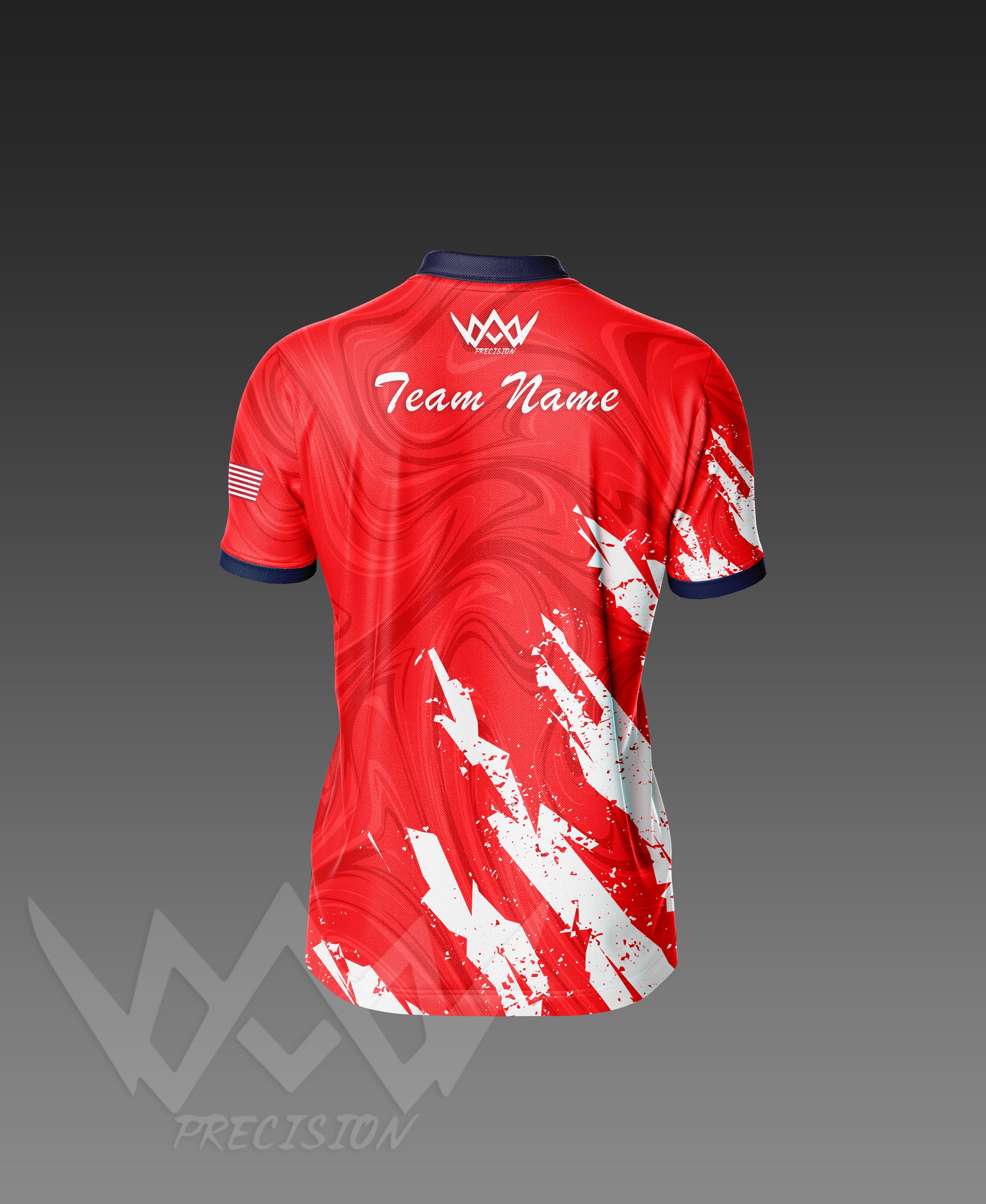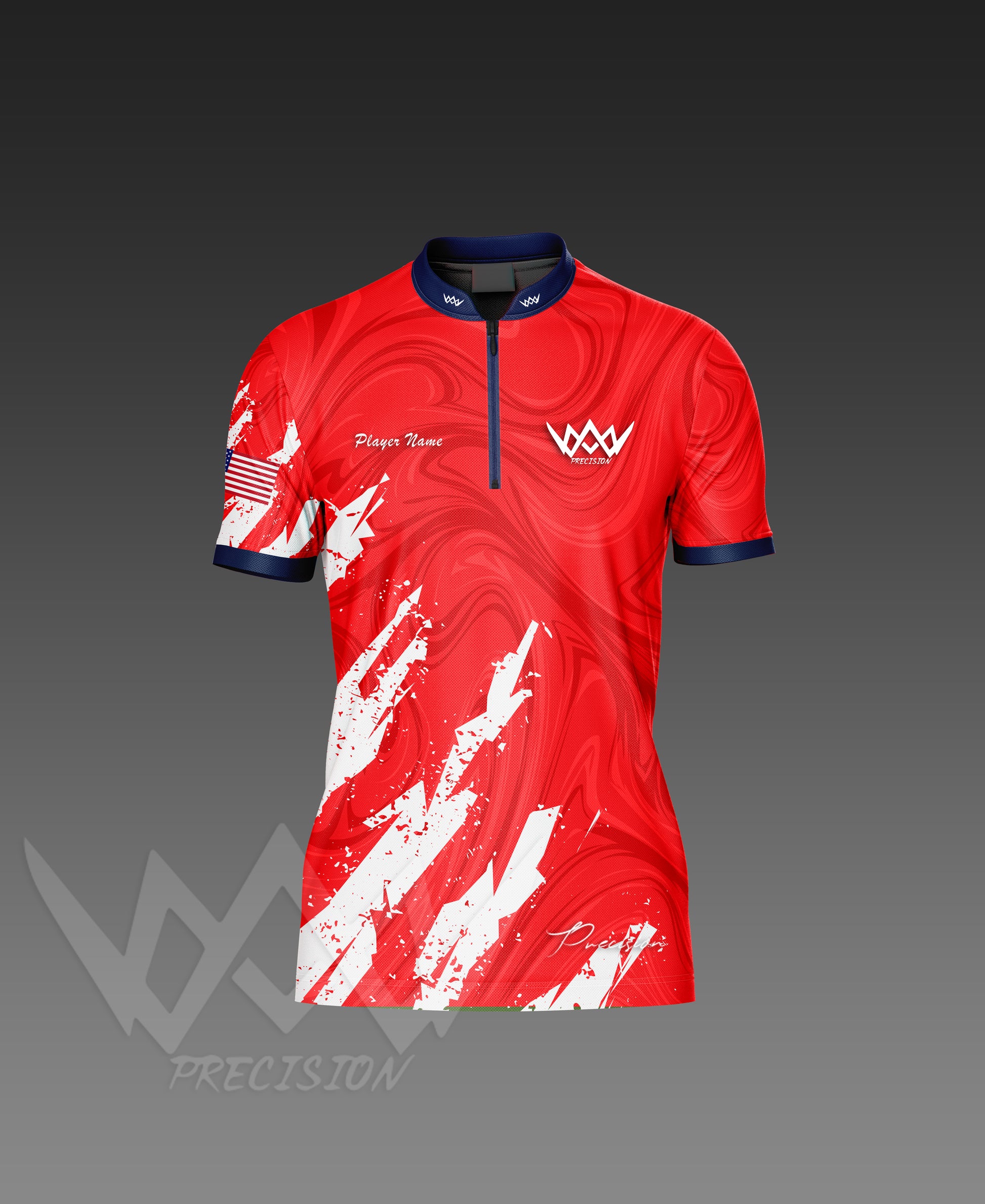 The Pro Series 7 jersey explodes with energy — a deep red swirl base ignited by sharp white streaks, balanced with navy collar and sleeve trim for a sleek finish. Crafted from high-performance, breathable fabric, it keeps you cool and comfortable through every match. Finished with the Precision logo, U.S. flag patch, and your custom name.
